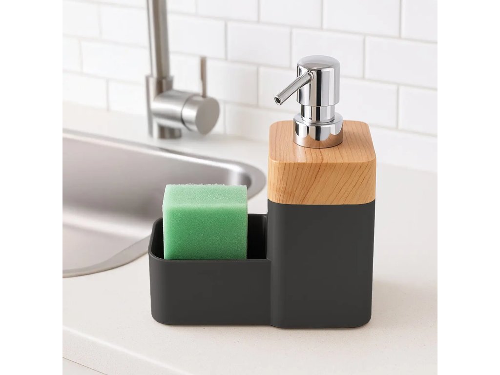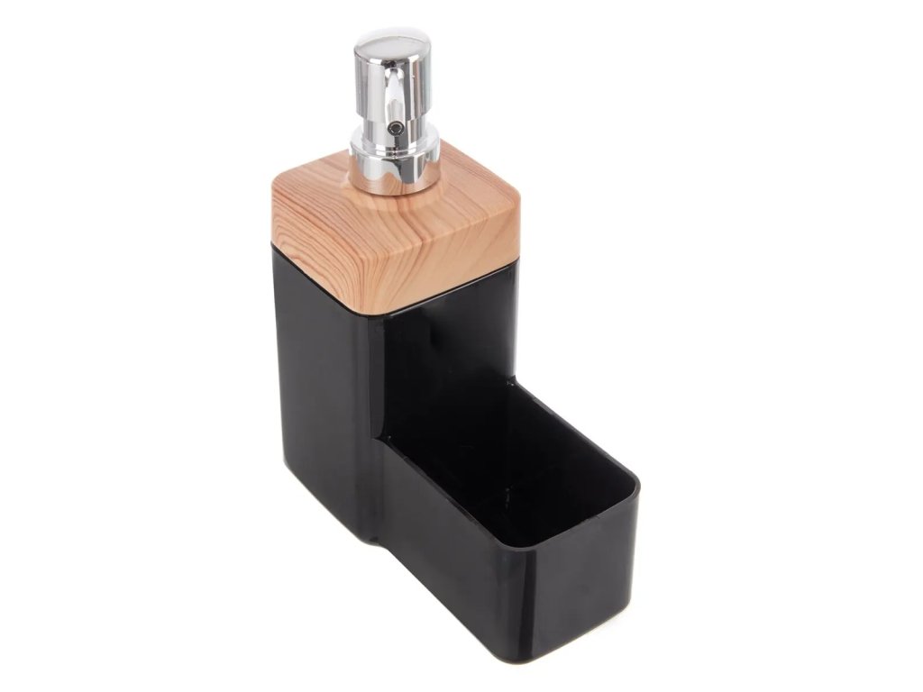 Dávkováč mydla alebo saponátu BLACK Wooden s organizérom 0,38 l v čiernej farbe. Súčasťou dávkovača je organizér na hubku alebo drôtenku. Dávkovač nezaberá veľa miesta a v kuchyni máte poriadok. Vyrobený z plastu PS (telo), ABS (mačkadlo), PP (hadička). Rozmery: 15,5x7,5x19,5 cm.