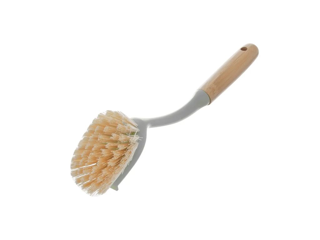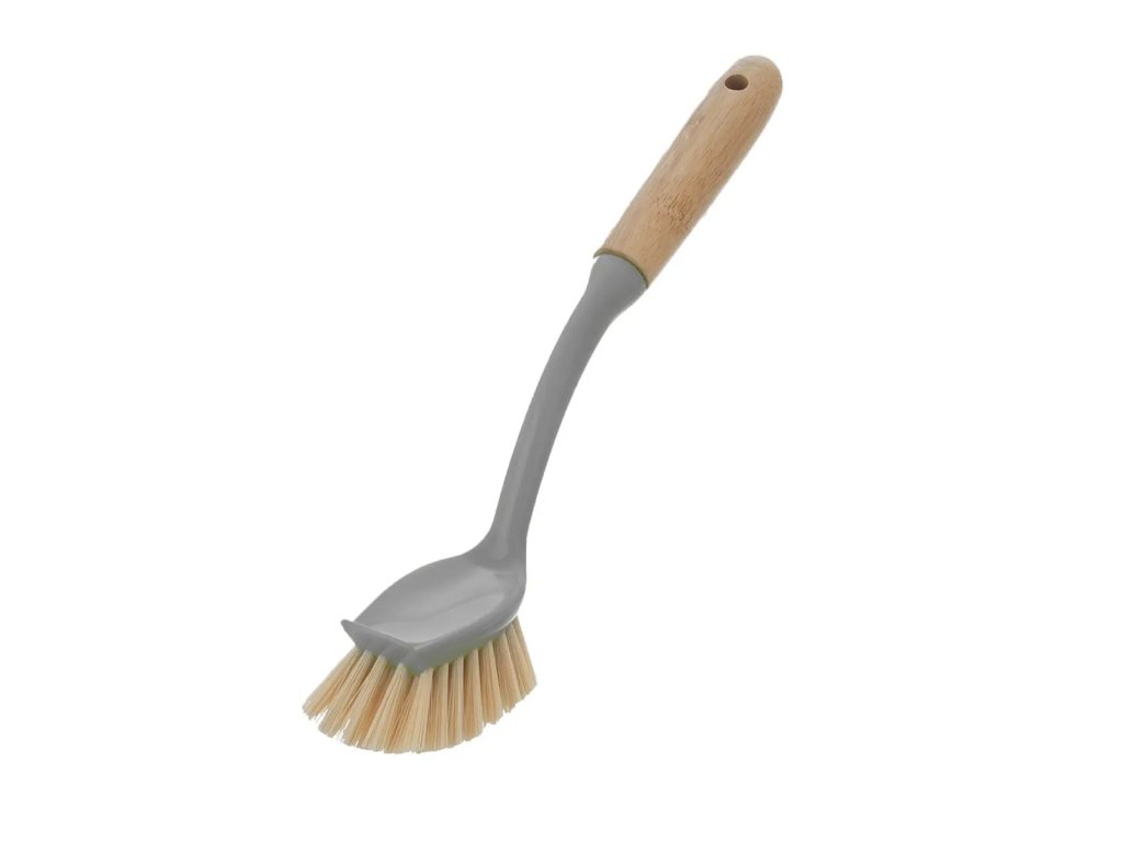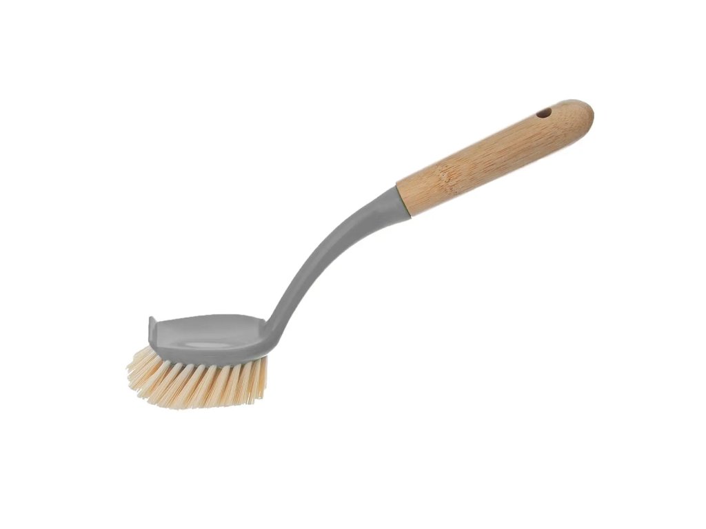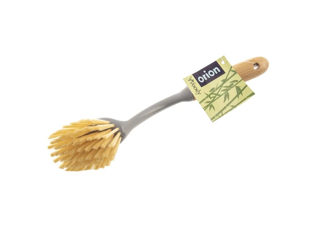 Plastová kefa na riad WOODY 28 cm s rukoväťou z bambusového dreva. Kefa, ktorá vám uľahčí umývanie riadu, vďaka svojmu tvaru. Husté štetiny umyjú odmočené nečistoty. Kefa disponuje otvorom na zavesenie.