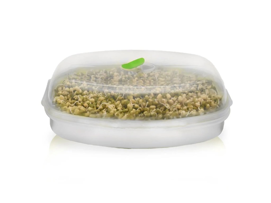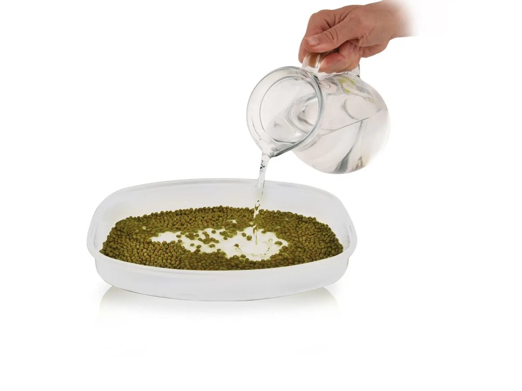 Plastová misa na klíčenie s viečkom a sitkom je vhodná pre klíčenie fazule mungo, žeruchy, šošovky a iných semien. Sitko a viečko disponujú menším otvorom, ktorý umožňuje prístup vzduchu.