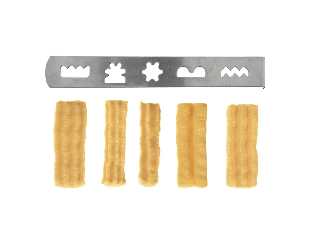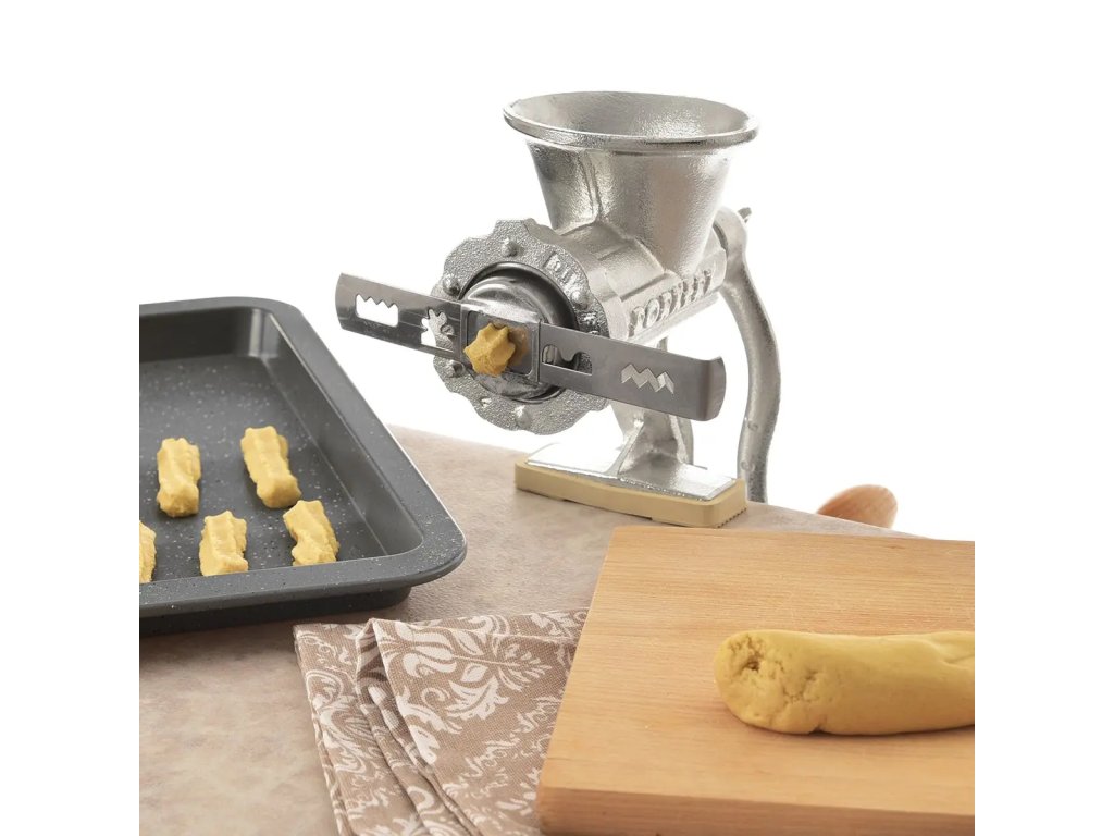 Návod: stačí vložiť cesto do strojčeka, pred otvor pre sušienky nasadiť okrúhly nadstavec s priemerom 5,7 cm a upevniť ho maticou. Potom si len posunutím 14 cm dlhej planžety vyberiete požadovaný tvar – či už chcete tradičné tyčinky, banániky alebo iné obľúbené tvary na zlepované pečivo. Sušienky si môžete odkrojiť na ideálnu dĺžku ostrým nožom.
