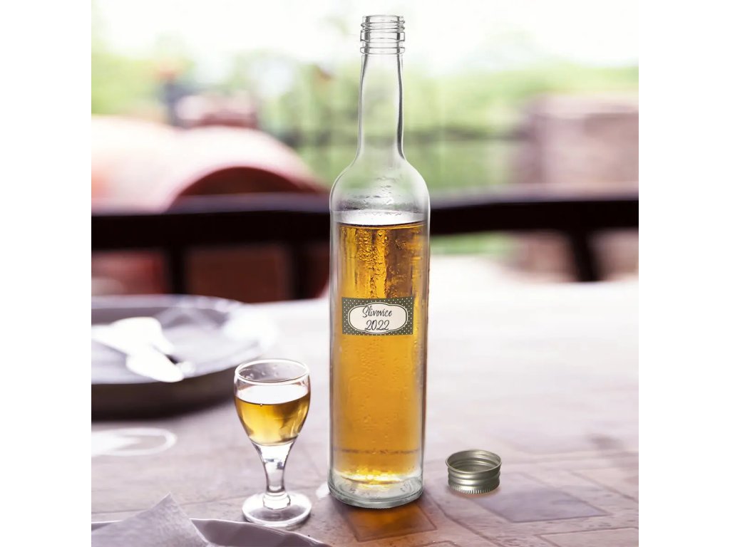 Hárok 12 ks prázdnych hnedých samolepiek na dózy s potravinami, zaváracie poháre alebo fľašu sirupu. Samolepky sú vyrobené z papiera s retro dekorom a drobnými bodkami na tmavom pozadí. Jedna nálepka má rozmer 7,3x3,5 cm.