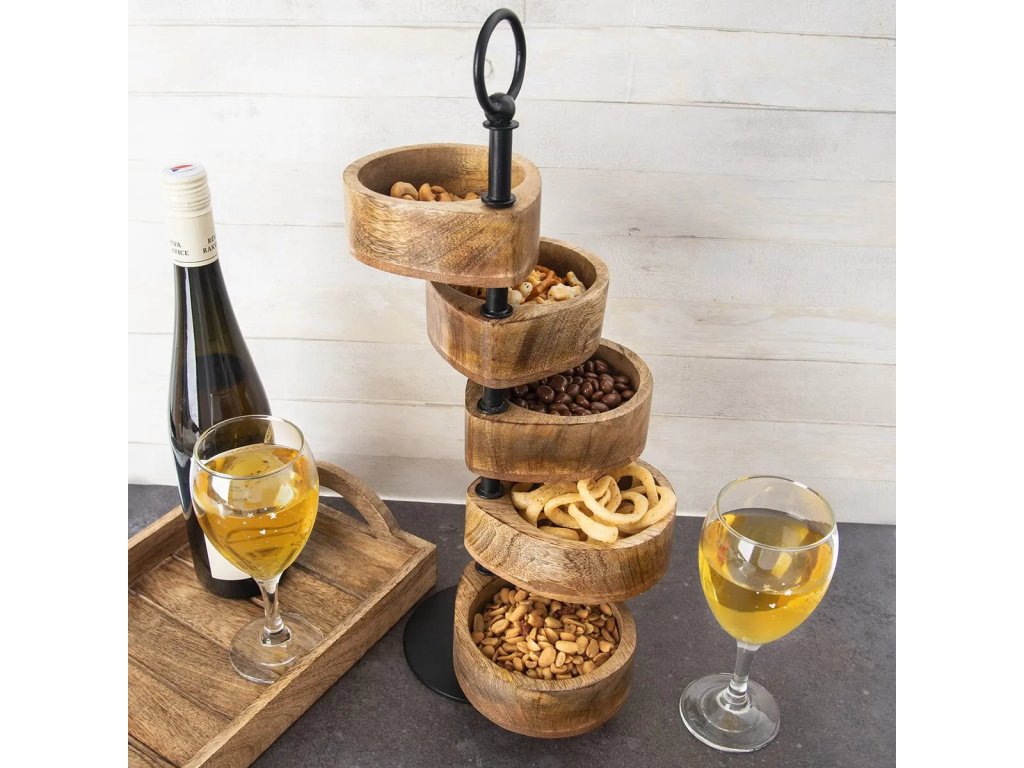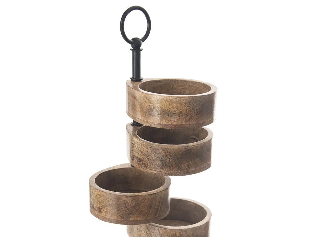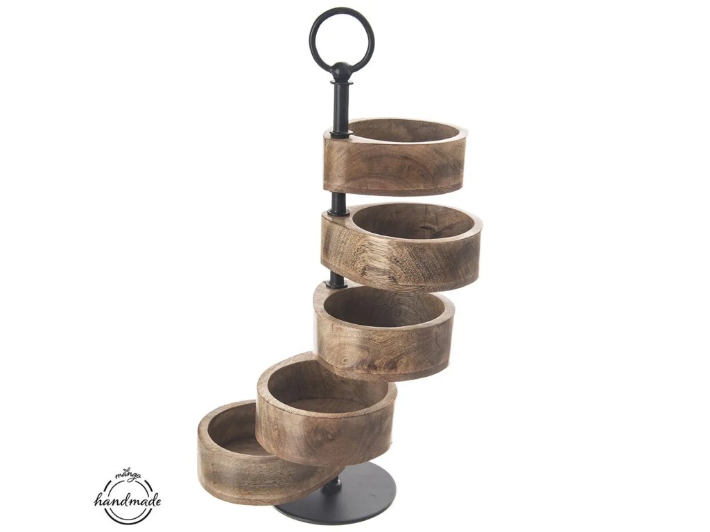Päťposchodový servírovací stojan MANGO s 5 ks miskami a kovovou základňou je vhodný na servírovanie slaných aj sladkých pochutín. Každé poschodie stojana s miskou je pohyblivé. Každá miska má priemer 12 cm a je na hostiteľovi do akej pozície ich rozloží a čím ich naplní. Misky sú vyrobené z kvalitného mangového dreva.