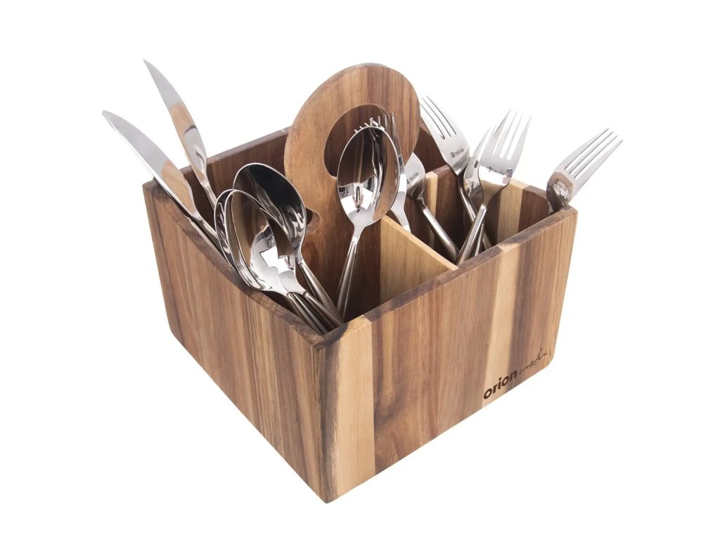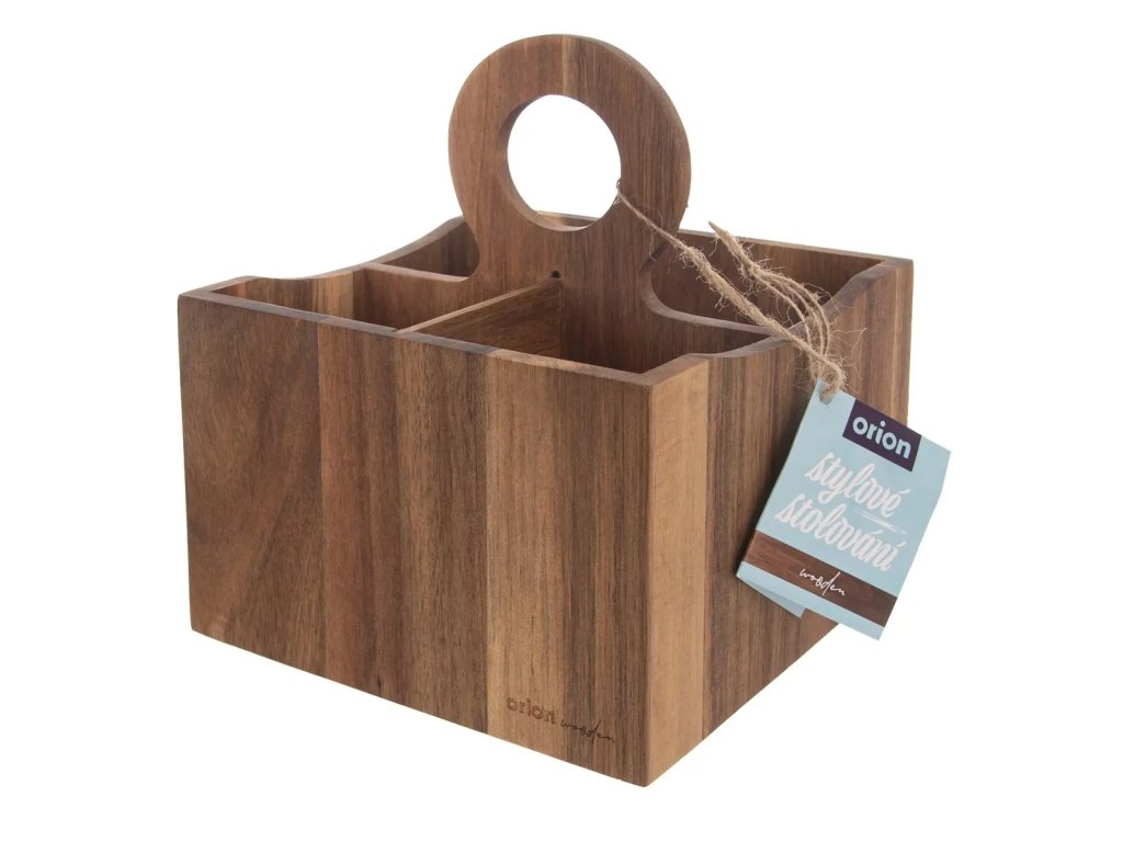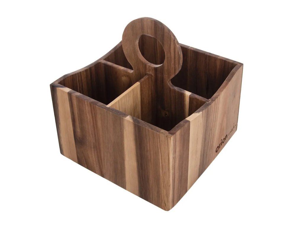 Drevený stojan veľkosti 18,5x18,5x20 cm je vhodný na prenášanie príborov, papierových obrúskov, dochucovadiel ale aj koreničiek. O prenášanie sa postará výrazná rukoväť. Stojan má 3 oddelené komory pre náčinia, koreničky, alebo obrúsky.