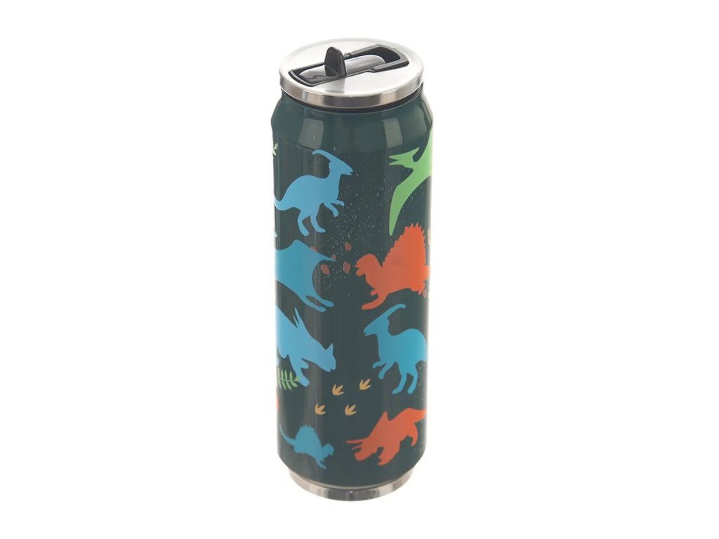 Termoska-plechovka s motívom DINOSAURY a objemom 0,5 l udrží nápoj dlho teplý alebo studený. Termoska v tvare plechovky s motívom DINOSAURY udrží 12 hod. teplú a 8 hod. studenú vodu. Čím viac je termoska naplnená, tým lepšie plní svoju funkciu. Termosku možno naplniť maximálne do 90 % plnenia. Odporúčané použitie: tesne pred plnením nalejte do termosky horúcu vodu pre teplé nápoje a studenú vodu pre studené nápoje. Takto termoska prijme teplo alebo sa naopak ochladí. Približne po piatich min. vodu vylejte a naplňte termosku nápojom. Pohodlné pitie zabezpečí výklopný plastový otvor vo viečku termosky. Viečko má závit so silikónovým tesnením, pred pretečením. Termoska je vyrobená z nehrdzavejúcej ocele a plastu.