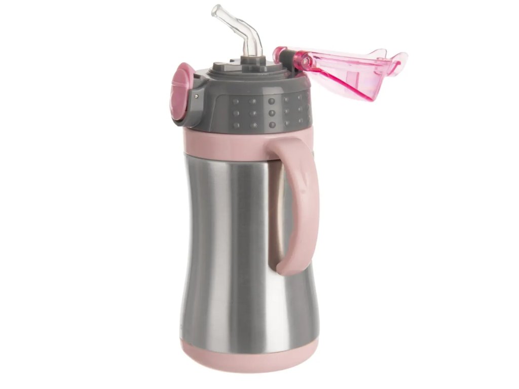 Nerezová dvojstenná ružová termoska 0,33 l so slamkou a výklopným viečkom. Termoska je vhodná do školy, na výlety alebo na dovolenku. Viečko sa uvoľní stlačením dolnej časti plastového otvárania, potom ho stačí zaklapnúť späť a nádoba je uzavretá. Pokiaľ tlačidlo posuniete hore, dôjde k uzamknutiu, čo zabráni nechcenému otvoreniu. Viečko je možné zaistiť proti spätnému zatváraniu viečka pomocou západky v zadnej časti viečka.