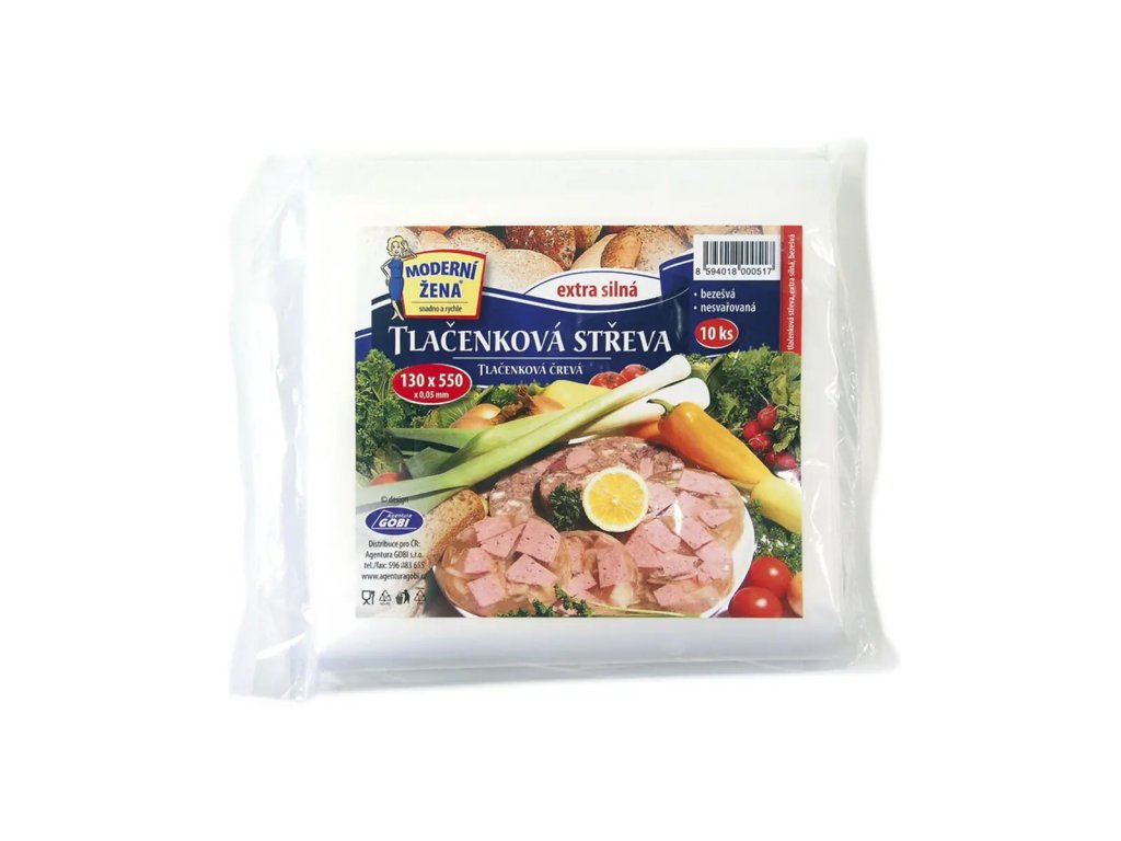 Balenie 10 ks tlačenkových sáčkov s rozmermi 13x55 cm. Vrecká sú extra silné, číre a bezšvové. Vhodné na výrobu mäsových a vaječných tlačeniek alebo paštét.