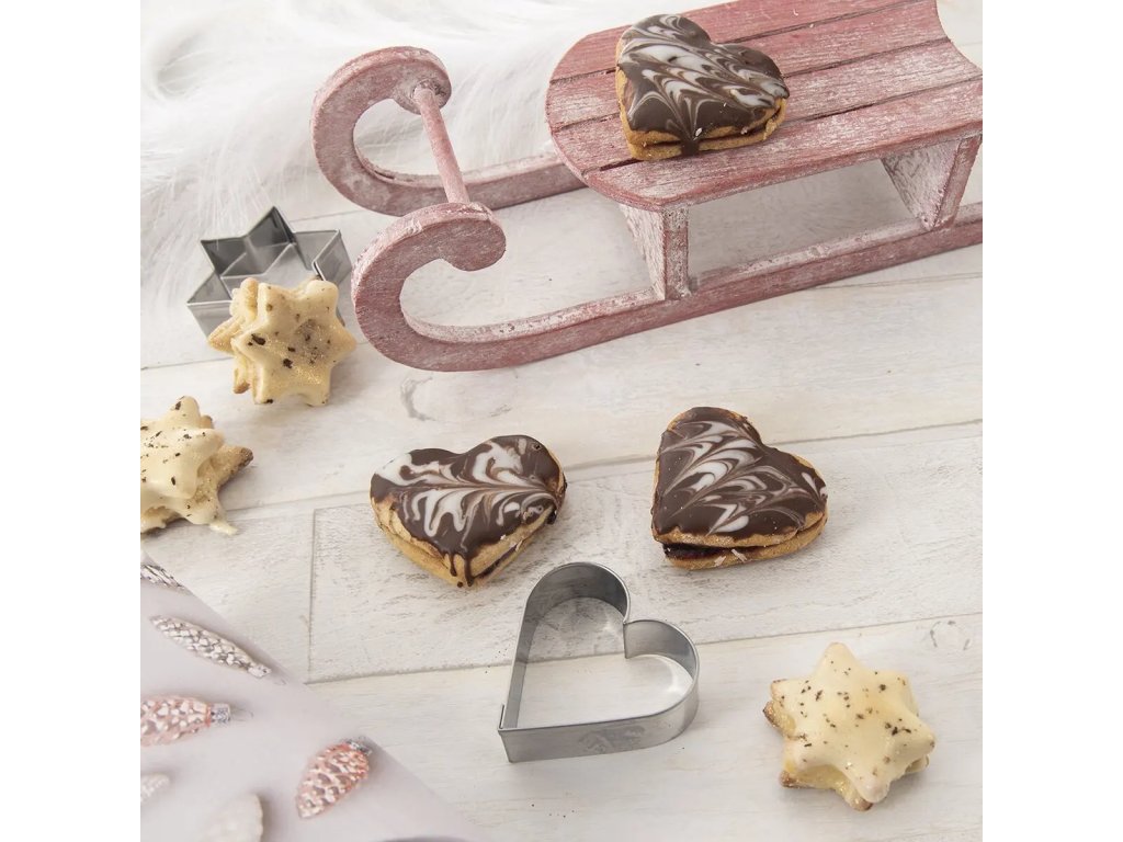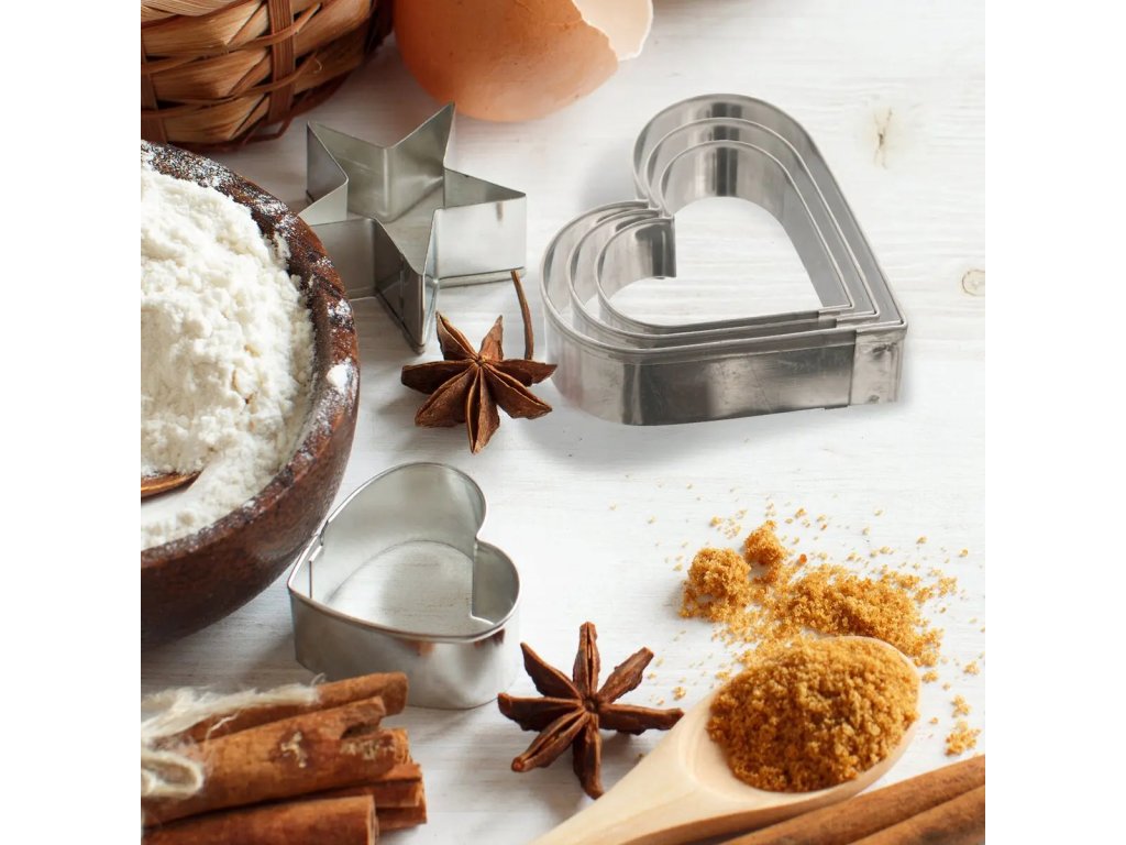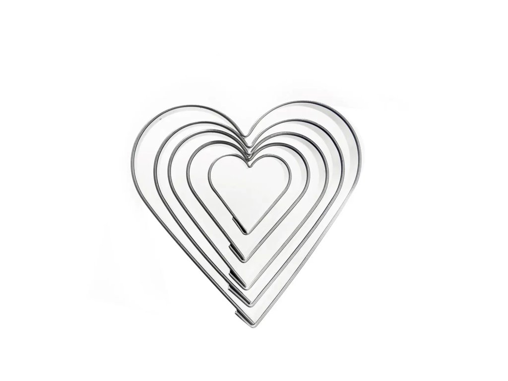 Súprava 5 kusov nerezových vykrajovačiek SRDCE s veľkosťami od 2 do 5,5 cm pre pečenie sušienok a koláčov. Vhodné aj na výrobu medovníkov, sušeniek, lineckého pečiva, perníkov, vďaka ostrým dolným hranám. Potom cukrovinku stačí len ozdobiť podľa vlastnej fantázie.