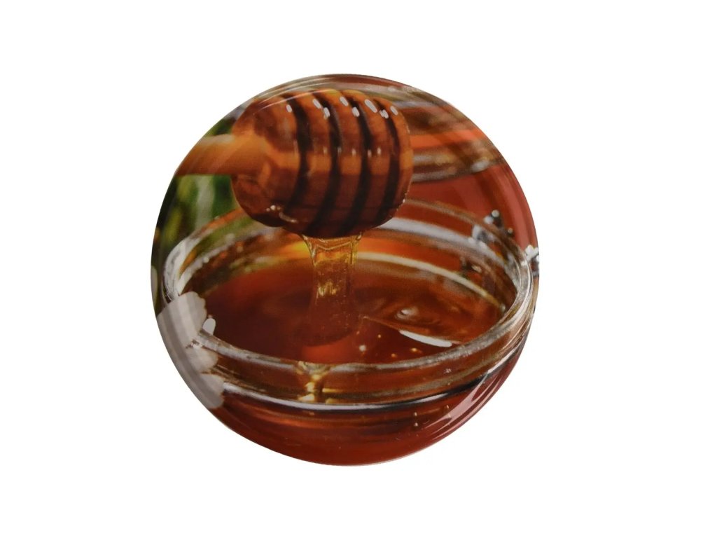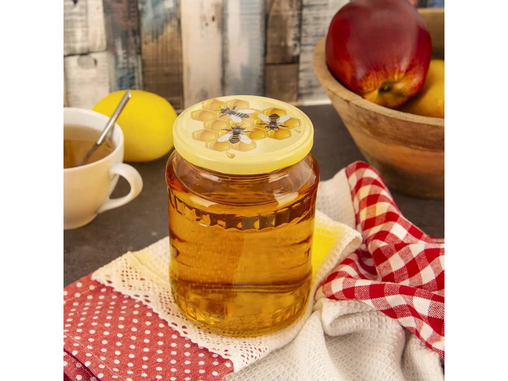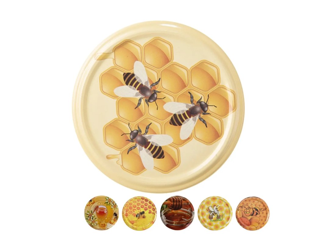 Súprava 10 kovových zaváracích viečok pr. 8,2 cm s medovým dekorom určených na poháre so závitom. Možno použiť viackrát. Dodávaný dekor závisí od aktuálnych skladových zásob (bez možnosti výberu).